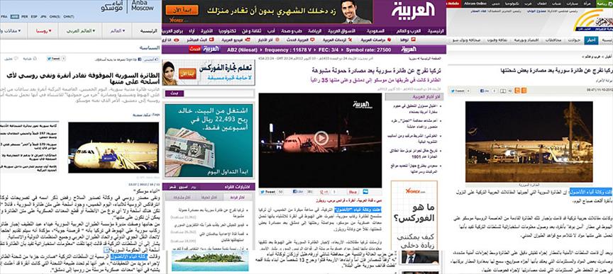 Londra'da yayın yapan el-Hayat gazetesi de, Türk Hava Kuvvetleri'ne ait savaş uçaklarının Suriye uçağını inmeye zorladığı ve uçakta 35 yolcu bulunduğu bilgisini verdi. Gazete, Dışişleri Bakanı Ahmet Davutoğlu'nun ''uçakta bulunan mahzurlu malzemelerin'' Türkiye tarafından alıkonulduğu yönündeki açıklamalarına da yer verdi.
