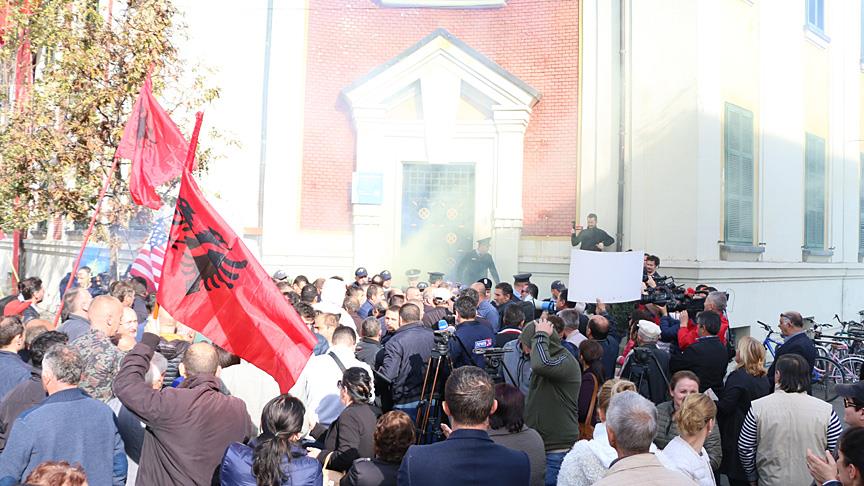 Göstericiler, kendilerini engelleyen polise sis bombası, yumurta ve molotofkokteyli attı.