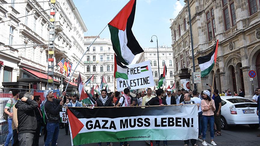 Avusturya'nın başkenti Viyana'da bir grup gösterici, ABD'nin Tel Aviv Büyükelçiliğini Kudüs'e taşımasını ve Nekbe'nin (Büyük Felaket) 70. yılını protesto etmek isteyen Filistinlilerin, toplandıkları Gazze sınırında İsrail askerlerince katledilişine tepki gösterdi.