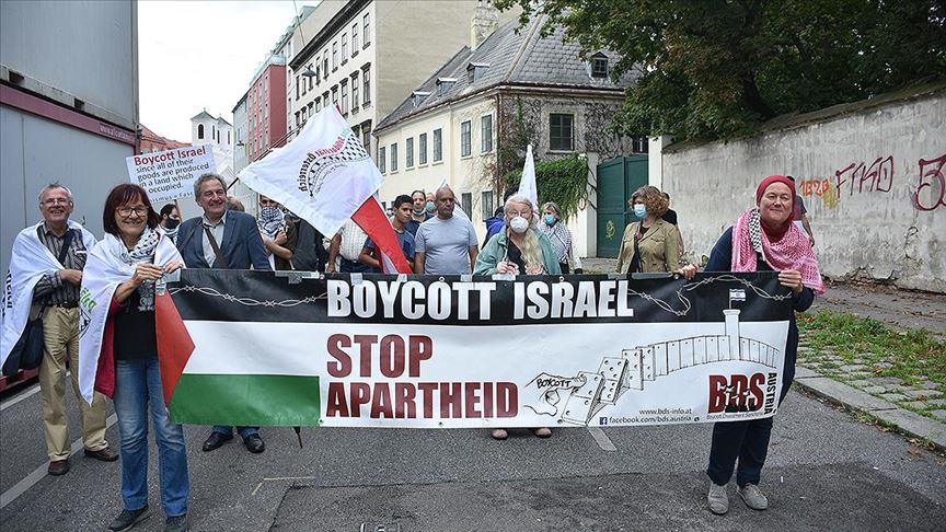 ABD'nin Viyana Büyükelçiliği önünde toplanan göstericiler, "Filistin topraklarının işgaline hayır", "Avusturya, İsrail ve ABD emperyalizmini desteklememeli" ve "İsrail’e boykot, işgale hayır" yazılı pankartlar açtı.