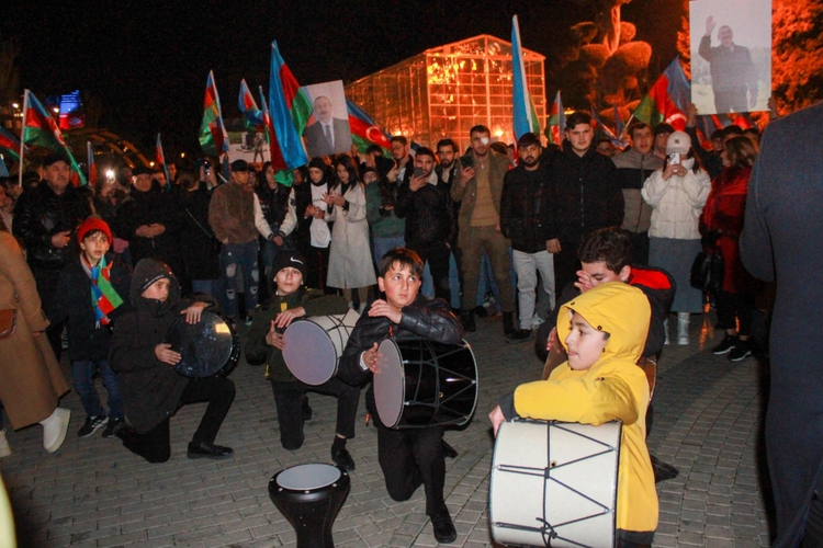Hazar Denizi kıyısındaki Ulusal Park'ta, Haydar Aliyev Merkezi'nin önündeki alanda ve Fevvareler Meydanı'nda toplanan vatandaşlar, müzik ve danslar eşliğinde Aliyev'in seçimde elde ettiği zaferi kutladı.