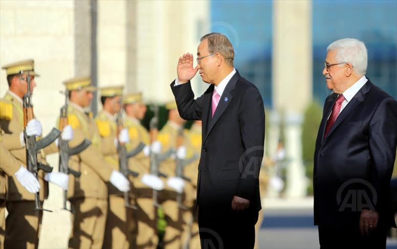 İsrail-Filistin barış müzakerelerine destek için çıktığı Ortadoğu turu kapsamında Filistin'e gelen Ban, Filistin Devlet Başkanı Mahmud Abbas ile Ramallah'ta görüştü.
