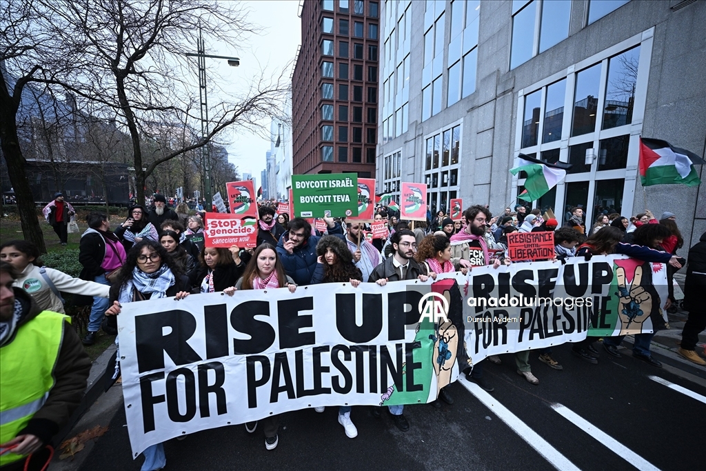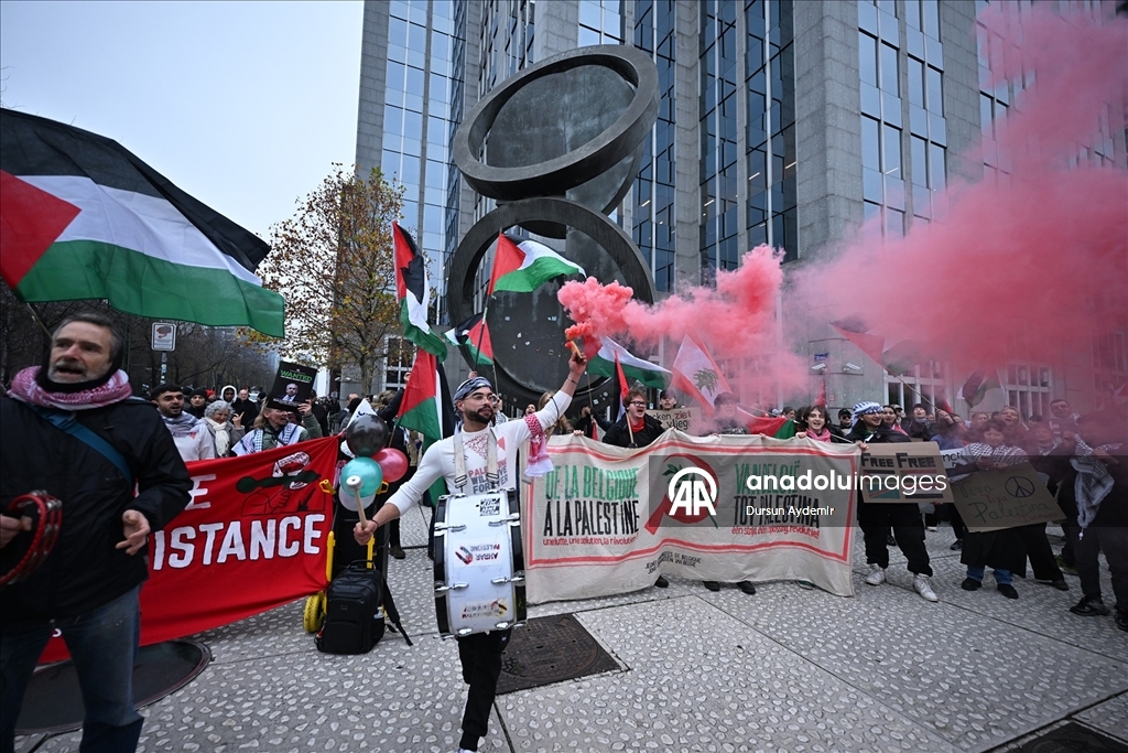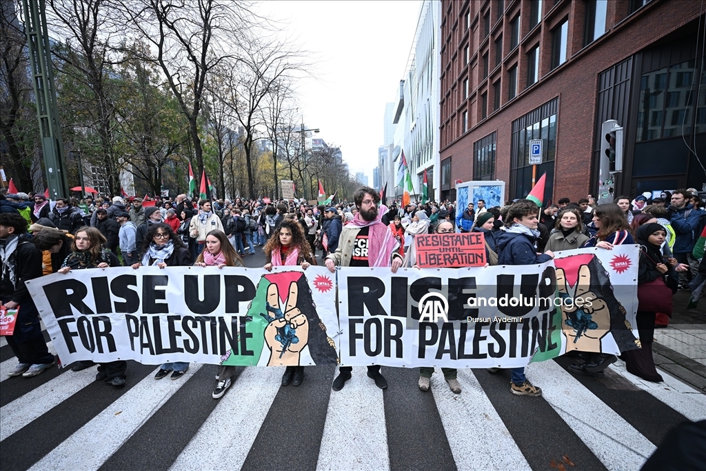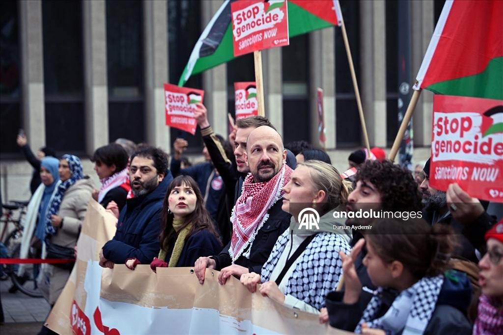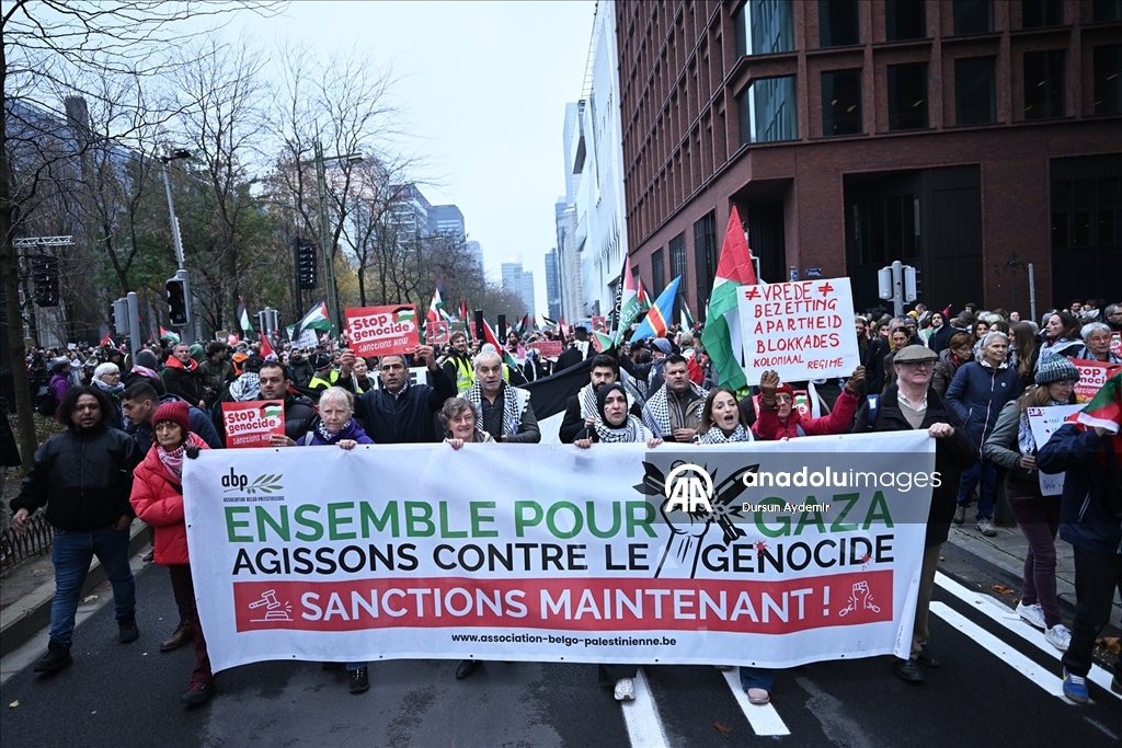 "Sivilleri bombalamak meşru müdafaa değil. Soykırıma hayır de!", "Kurtuluşa erişene kadar direniş!" ve "Filistin için ayağa kalkın!" yazılı dövizler taşıyan göstericiler, Belçika hükümetini İsrail'e karşı kapsamlı askeri ambargo uygulamaya davet etti.