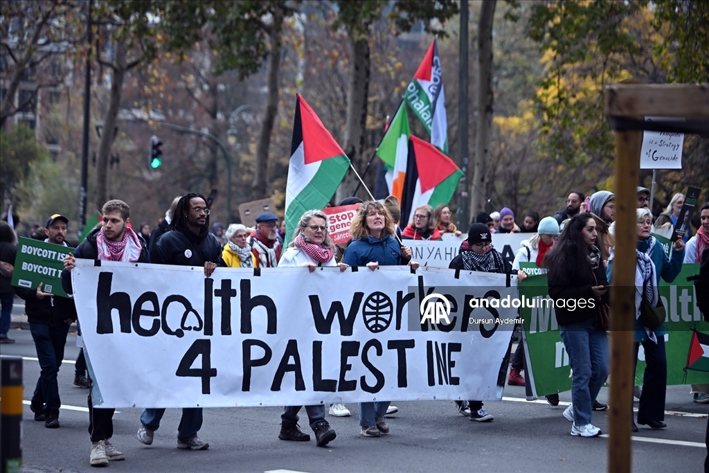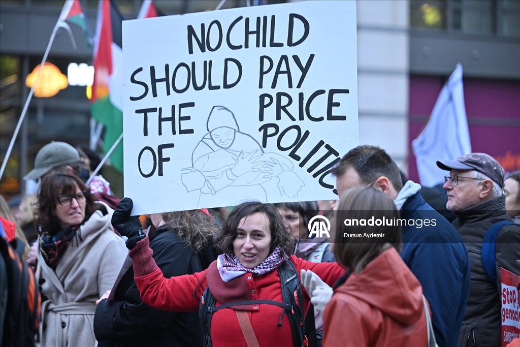 Başkentteki Kuzey Tren İstasyonu'nda bir araya gelen binlerce gösterici, Avrupa Birliği (AB) ile İsrail arasındaki Ortaklık Anlaşması'nın derhal askıya alınmasını talep etti.
