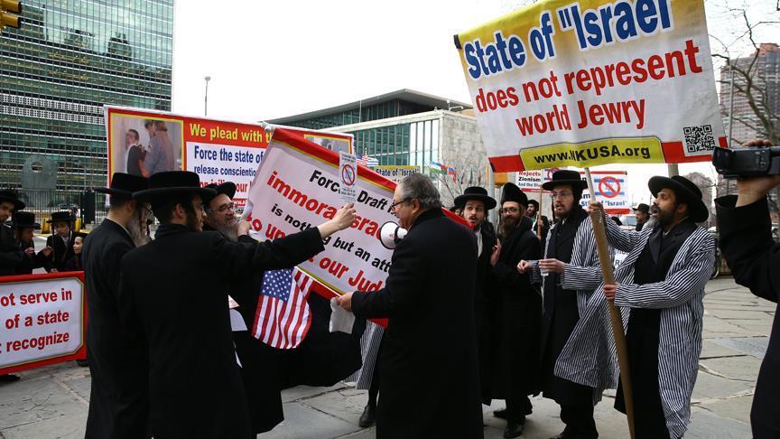 İsrail devletine ve Siyonizme karşı olan Ortodoks Yahudiler, Birleşmiş Milletler binası önünde, İsrail'in zorla askere alma uygulamasını protesto etmek için toplandı.
