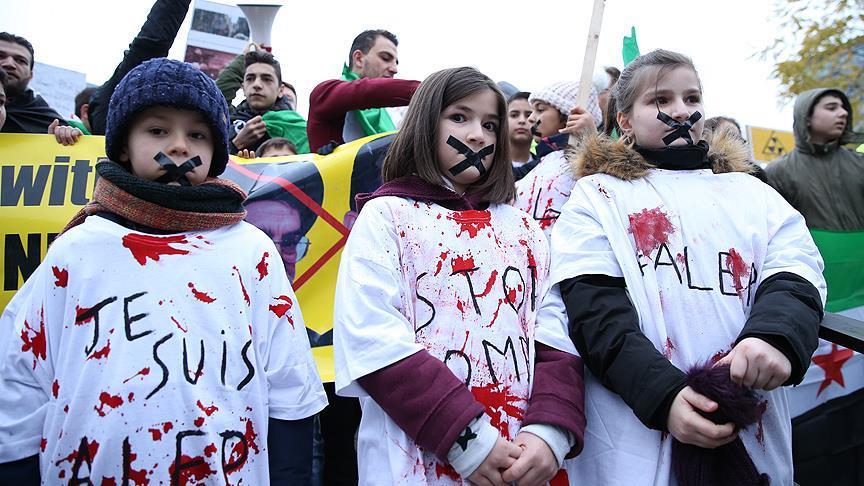 Bazı sivil toplum örgütlerinin girişimiyle Avrupa Birliği binalarının önündeki Schuman Meydanı'nda düzenlenen gösteriye yüzlerce kişi katıldı. Göstericiler, ''Halep'i kurtarın", "Ailelerimiz Halep'te", "Halep yanıyor", "Halep'te katliam var'' yazılı dövizler ve Türk bayrakları taşıdı.