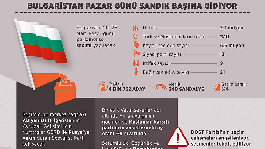 Bulgaristan'da pazar günü yapılacak genel seçimlerin merkez sağ partisi GERB ile Sosyalist Parti arasında büyük çekişmeye sahne olması bekleniyor. Yeni kurulan DOST Partisi ise Türk ve Müslümanların oylarıyla ülke siyasetinde yeni bir yer edinmeye hazırlanıyor.