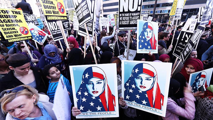 Son dönemde ABD genelinde gerçekleşen protestoların sembolü haline gelen başı ABD Bayrağı ile örtülü kadın resminin yanı sıra “Trump benim başkanım değil”, “Trump örmek istediği duvarın altında kalacak”, “Göçmenler ve Müslümanlar hoş geldiniz” yazılı pankartların taşındığı gösteri, Chicago caddelerinde gerçekleşen yürüyüşle devam etti.