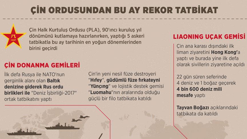 Çin Halk Kurtuluş Ordusu (PLA), 90'ıncı kuruluş yıl dönümünü kutlamaya hazırlanırken, ülkenin dört bir yanında ve uluslararası denizlerde gerçekleştirdiği tatbikat ve askeri faaliyetlerle tarihinin en yoğun dönemlerinden birini yaşıyor.