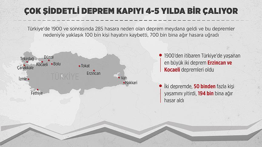 Gazi Üniversitesi Deprem Mühendisliği Uygulama ve Araştırma Merkezi Uzmanı Doç. Dr. Bülent Özmen, Türkiye'de ortalama her 4-5 yılda büyüklüğü 7'nin üzerinde (çok şiddetli) bir deprem yaşandığına dikkati çekerek 1900 yılı ve sonrasında 285 hasara neden olan depremde 100 bin kişinin öldüğünü ve 700 bin konutun hasara uğradığını belirtti.
