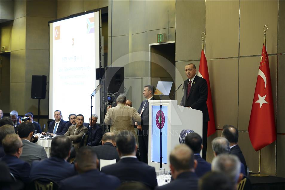 İş adamlarının da desteğiyle bu vizyonun hayata geçirileceğine inandığını söyleyen Erdoğan, Afrikalı iş adamlarına, "Sizlerden Türkiye'ye güvenmenizi, Türkiye'nin münbit yatırım ortamına inanmanızı istiyorum. Bunun için Türk iş adamlarıyla irtibatınızı her alanda daha da güçlendirmenizi talep ediyorum ve bu toplantımızın çok daha geniş, zengin katılımlı olanını inşallah İstanbul'umuzda gerçekleştirmeyi şimdiden arzu ettiğimi duyuruyorum." diye hitap etti.