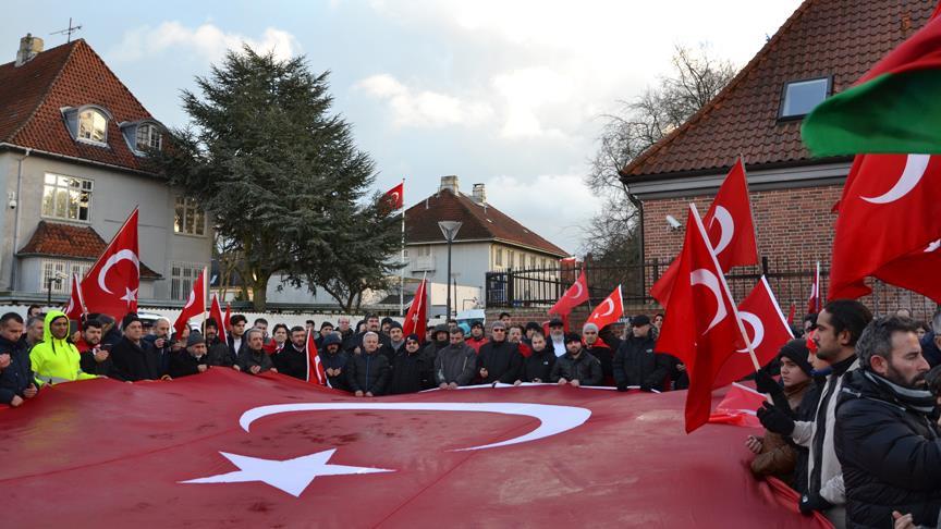 Türkiye'nin Kopenhag Büyükelçiliği önünde yerel saatle 14.00 sularında toplanan binlerce kişi, Beşiktaş ve Kayseri'de meydana gelen hain saldırıları kınadı. Azerbaycanlıların ve Kuzey Iraklı Türkmenlerin de destek verdiği mitingde Suriye'nin El Bab kasabasında şehit olan Türk askerleri de anıldı.
