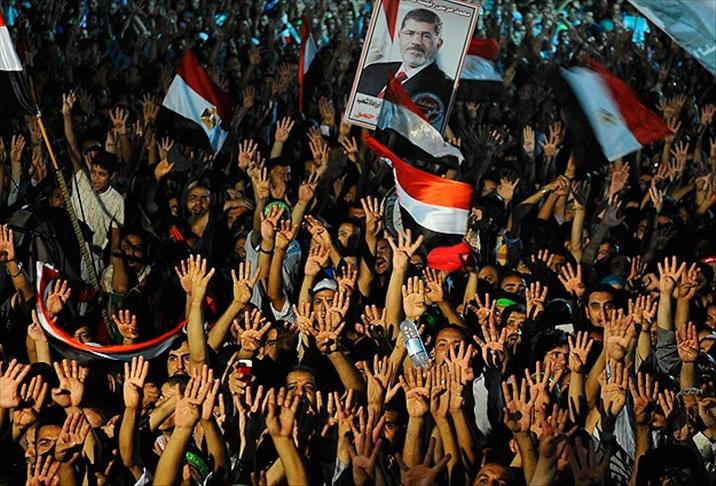 Meşruiyetin dönmesini isteyen göstericiler seçilmiş Cumhurbaşkanı Muhammed Mursi'nin posterlerini taşıdı ve "Rabia işareti" yaptı.