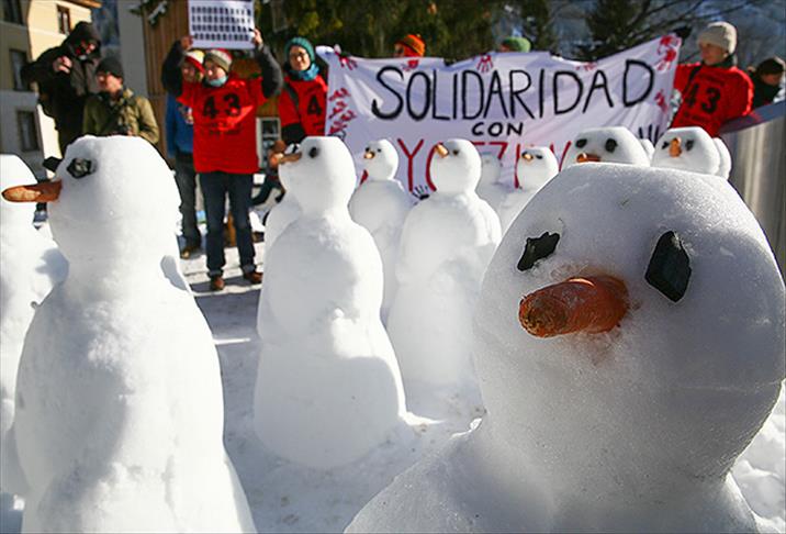 Meydana kardan adamlar yapan göstericiler, Davos toplantılarını protesto dışında, Meksika’nın Guerrero eyaletinde bir protesto gösterisinden sonra 43 öğrencinin 26 Eylül'de ortadan kaybolması ve hala bulunamaması ile Suudi Arabistanlı blog yazarı Raif Badawi'ye kırbaç cezası verilmesine dikkat çekti.