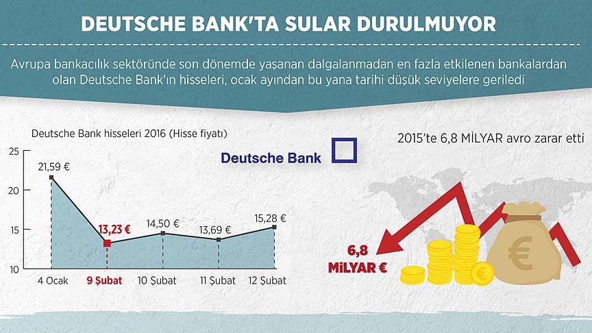 Yaşanan gelişmelerin ardından Almanya'nın en büyük bankası konumundaki Deutsche Bank'ın hisseleri 9 Şubat Salı günü son 30 yılın en düşük seviyesine geriledi. Salı gününü yüzde 4'lük değer kaybıyla kapatan Deutsche Bank hisseleri 4 Ocak 2016’da 21,59 avrodan işlem görürken 9 Şubat’ta 13,23 avroya kadar geriledi. Bankanın hisseleri çarşamba günü hafif toparlanmayla 14,50 avrodan kapattı. Perşembe günü tekrar gerileyen banka hisseleri günü 13,69 avrodan kapatırken, haftanın son günü ise 15,28 avro olarak belirlendi.