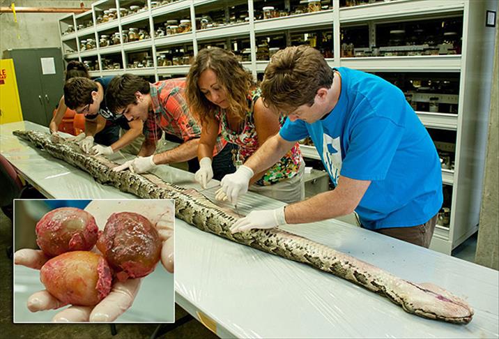 Florida Üniversitesi'nden yapılan açıklamada, Florida eyaletinde şimdiye kadar rastlanan en büyük yılan olan pitonun 87 yumurtasıyla birlikte bulunduğu belirtildi.