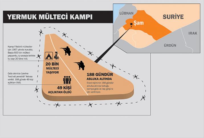 Esed rejiminin abluka uygulayarak gıda ve ilaç girişine izin vermediği Yermuk Mülteci Kampı'nda açlıktan dolayı şu ana kadar 49 mültecinin hayatını kaybettiği ifade ediliyor.