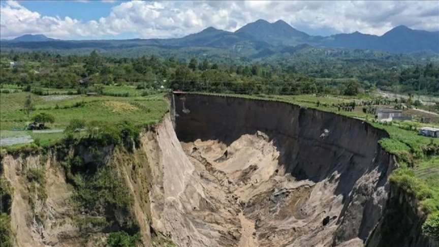 Açıklamada, genişliği 30 bin metrekareyi aşan ve derinliği 100 metreye ulaşan çukurun heyelan sonucu oluştuğu belirtildi.
