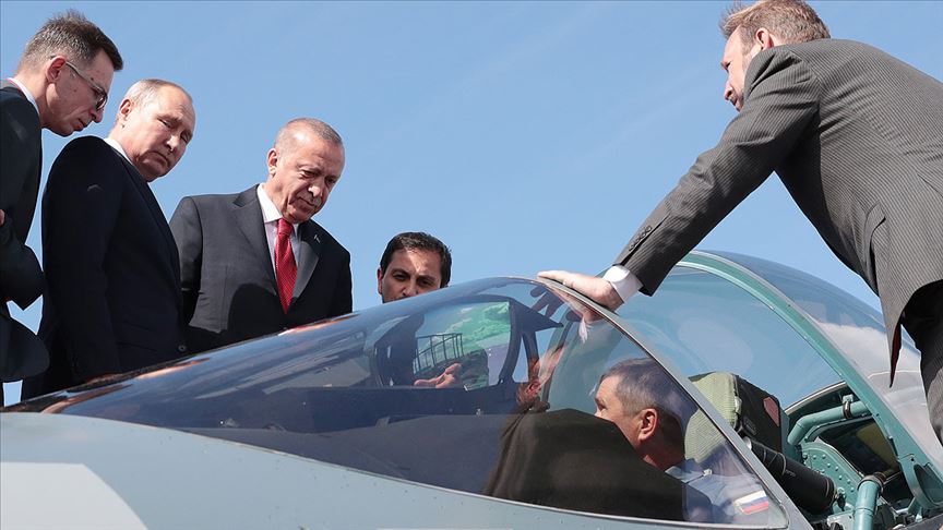 Rus savaş uçağı "Su-57" ile Türkiye'ye satın alınması için teklif edilen "Su-35" ve "Su-34" tipi savaş uçaklarının gösterisini Erdoğan ve Putin birlikte izledi.