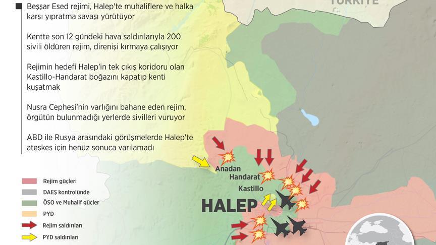 Suriye'de Beşşar Esed rejimi, yaklaşık 2 haftadır Halep merkezdeki muhaliflere ve sivillere karşı yıpratma savaşı yürütüyor. Rejim, hava saldırılarında 200 sivili öldürdüğü kenti kuşatarak dünyayla bağlantısını kesmek için saldırıyor. ABD'nin ateşkes için Rusya'yı ikna etme çabaları ise henüz sonuç vermedi.