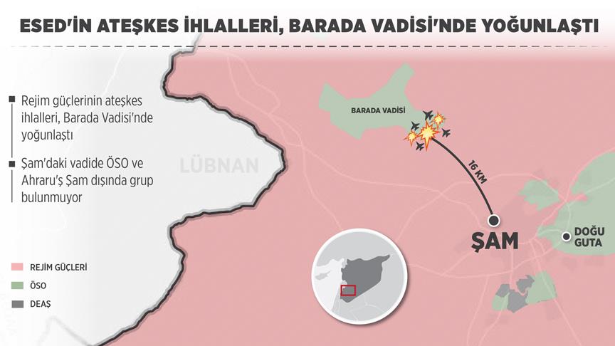 Esed ordusu ve Hizbullah güçleri iki hafta önce Halep merkezini tamamen ele geçirmelerinin ardından saldırılarını, Şam'daki Barada Vadisi ve çevresine yoğunlaştırdı. İki haftadır yoğun saldırıların hedefi olan Barada Vadisi, ateşkesten sonra da sık sık varil bombalarıyla hedef alınıyor. AA muhabirleri, bölgenin dün gece 2'si varil bombalı 4 hava saldırısıyla hedef alındığını, saldırıların geceden bu yana devam ettiğini bildirdi.