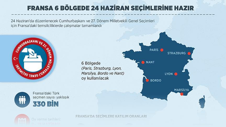 Paris Başkonsolosluğu ve Bordo Başkonsolosluğunda sandık kurulacak. Seçmenlerin başkonsolosluk binasında oyunu kullanabileceği bir diğer bölge de Nant.