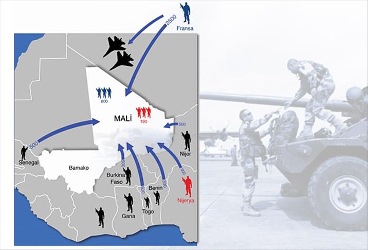 Fransa, önümüzdeki günlerde bu sayıyı kademeli olarak 2 bin 500'e çıkartmayı planlıyor. Bölgedeki ülkelerin vereceği 3 bin 700 askerlik kuvvetle dışarıdan gelerek askeri müdahaleye katılan asker sayısı 6 bini aşacak.