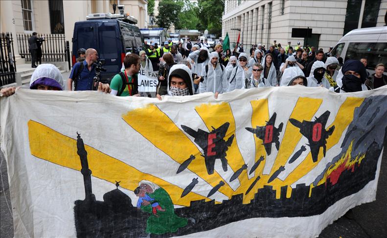 Kapitalizm karşıtı yaklaşık 200 kişilik bir grup, "BAE Systems" isimli İngiliz güvenlik ve savunma şirketininLondra'nın merkezindeki binasının önünde yerel saatle 14.00'de toplandı.