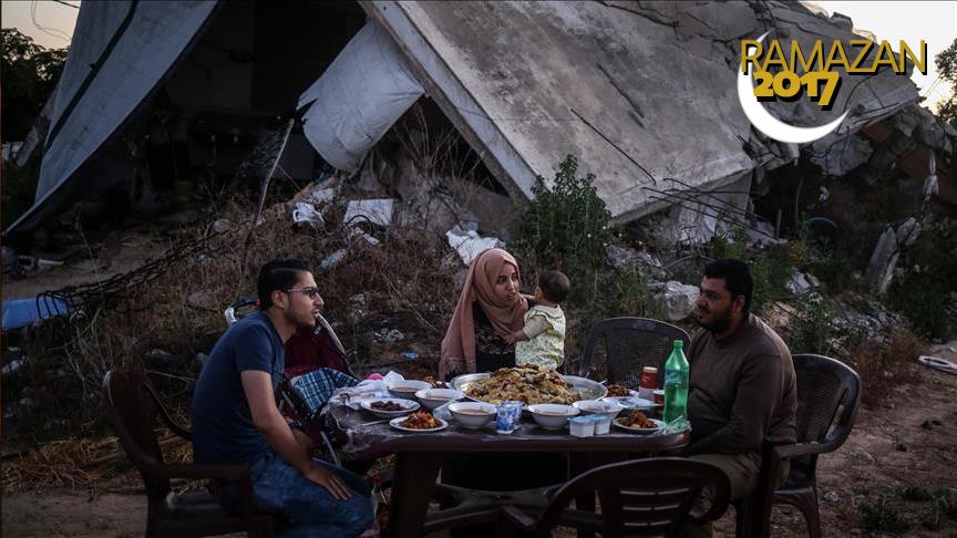 Filistinli Şahin ailesi üç yıldır, İsrail'in Temmuz 2014'te Gazze'ye düzenlediği saldırılar sırasında yıkılan evlerinin yanında, hala kaldırılmayı bekleyen enkazların arasında iftar ediyor.