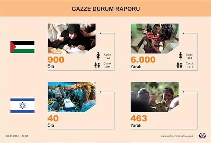 Gazze'de görevini fiilen sürdüren eski Filistin Hükümeti Sağlık Bakanlığı Sözcüsü Dr. Eşref el-Kudra, AA muhabirine yaptığı açıklamada, İsrail'in Gazze Şeridi'ne hava, kara ve denizden düzenlediği saldırılarda 250'si çocuk, 102'si kadın olmak üzere en az 900 kişinin hayatını kaybettiğini, 6 bin kişinin de yaralandığını belirtti.
