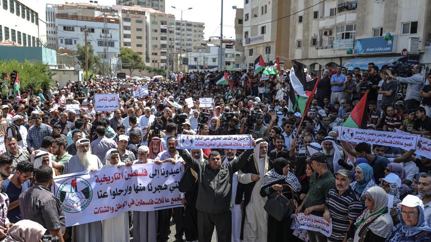 Büyük Dönüş Yürüyüşü Koordine Heyeti tarafından düzenlenen gösteriye katılanlar, "Komplolar gerçekleşmeyecek", "Bizi açlığa terk edemezsiniz" yazılı pankartlar taşıdı.