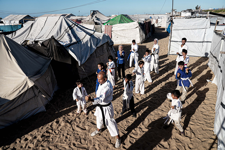 Gazze Şeridi’nde, İsrail saldırıları nedeniyle evlerini terk edip çadırlara sığınan çocuklar ve gençler, Han Yunus’a bağlı Mevasi bölgesinde çadırlar arasında karate eğitimi alıyor.