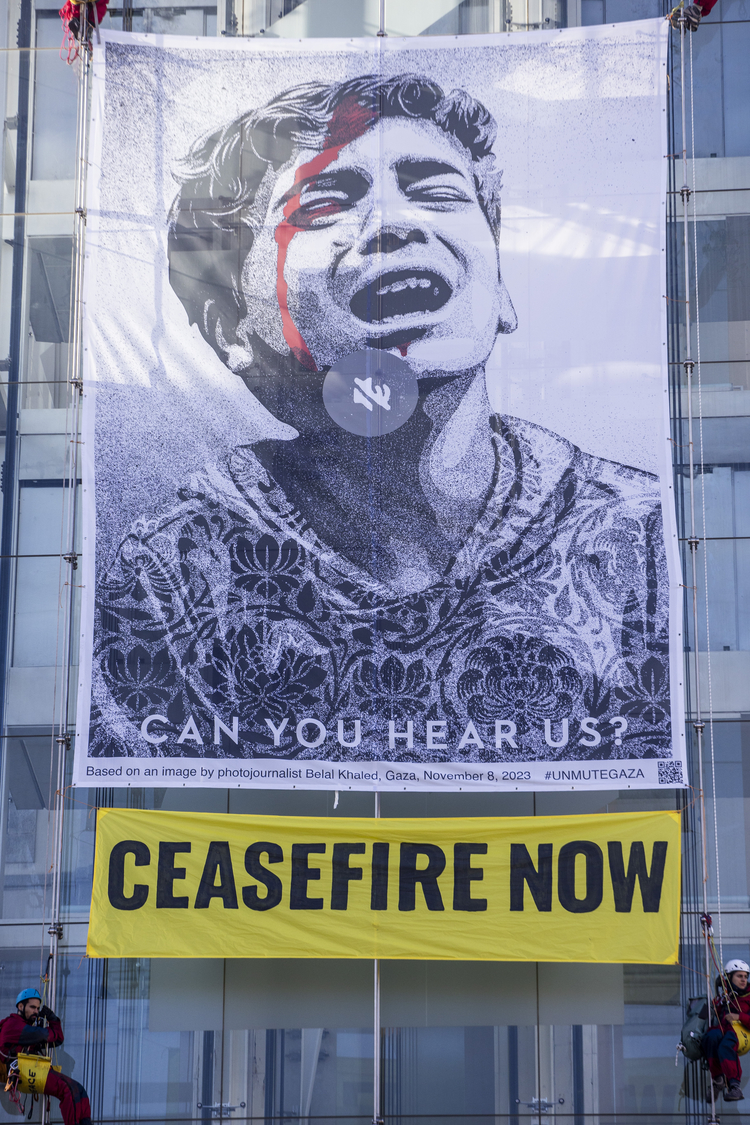 Greenpeace, açtığı dev pankartta, AA Gazze Foto Muhabiri Belal Khaled'in 7 Kasım 2023'te Gazze'de çektiği, İsrail ordusunun Deir Al Balah ve Han Yunus kentine düzenlediği saldırılar sonucu aralarında çocuklarında bulunduğu yaralıların hastaneye getirilmesinin anlatıldığı, başı kanlar içinde olan bir çocuğun fotoğrafını kullandı.