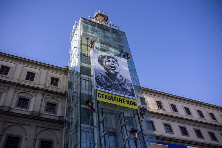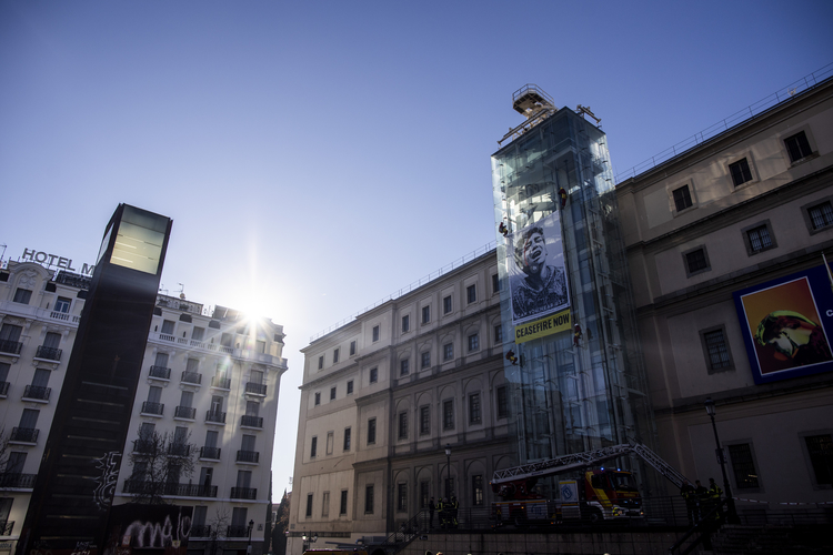 Uluslararası çevreci örgüt Greenpeace, İspanya'nın başkenti Madrid'deki Reina Sofia Müzesi'nin ana giriş kapısına, Filistin'e destek için açtığı dev pankartta, Anadolu Ajansının (AA) Gazze Şeridi'nden yayına verdiği fotoğrafı kullandı.