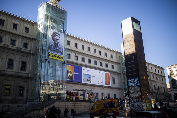 Ünlü ressam Pablo Picasso'nun, İspanya İç Savaşı'nı anlattığı ve son dönemlerde Gazze'deki saldırılarla özdeşleştirilen "Guernica" adlı tablosunun sergilendiği müzenin ana giriş kapısına asılan dev pankartta, İsrail'in Gazze Şeridi'ndeki saldırıları kınanarak, ateşkes talep edildi.