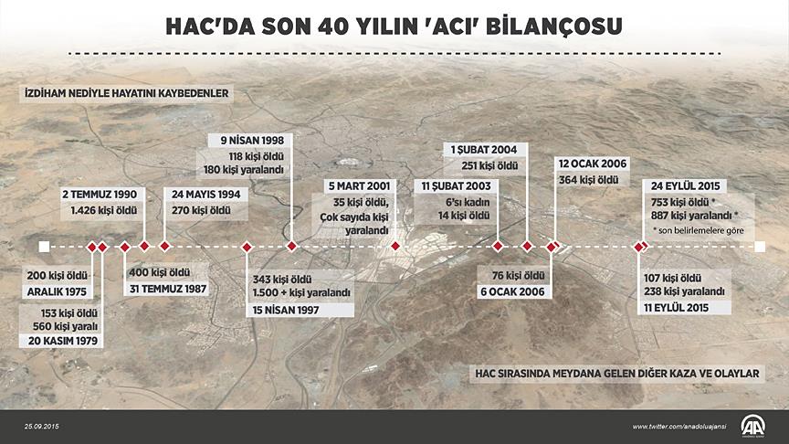 Mina'da yaşanan ve 753 kişinin öldüğü, 887 kişinin yaralandığı izdihamın, son 40 yılın en büyük ikinci faciası olduğu belirtiliyor.