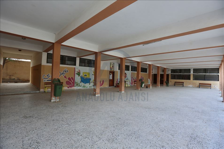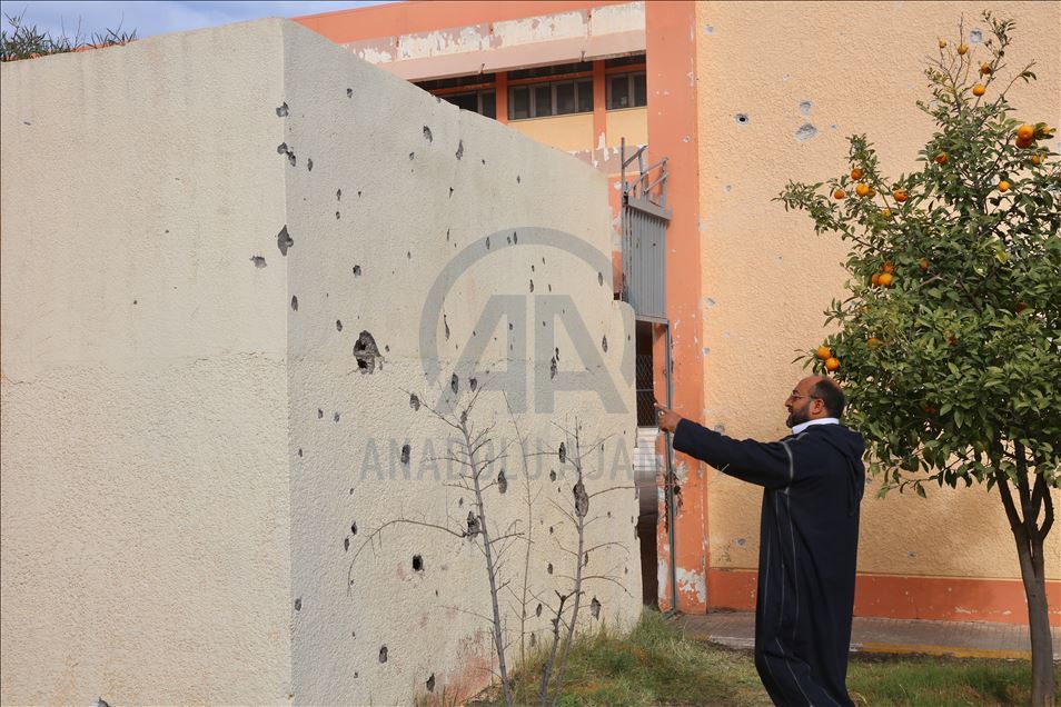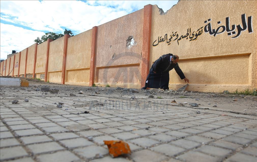 Libya’nın doğusundaki darbeci lider Halife Hafter’in başkente yönelik saldırısında ayrım gözetmeksizin yaptığı bombalama, öğrencileri eğitimden, okul bahçelerini de çocuk seslerinden mahrum bıraktı. AA ekibi, Hafter milislerinin ayrım gözetmeden bombaladığı Mitiga Havalimanı çevresindeki, üç ayrı top mermisinin isabet ettiği Şürfet el-Mellaha mahallesindeki okulu ziyaret etti. Okul Müdürü İzzeddin Cuma Zayid, okula düşen top mermisinin isabet ettiği yeri ve duvarlarda bıraktığı hasarı gösterdi. ( Hazem Turkia - Anadolu Ajansı )
