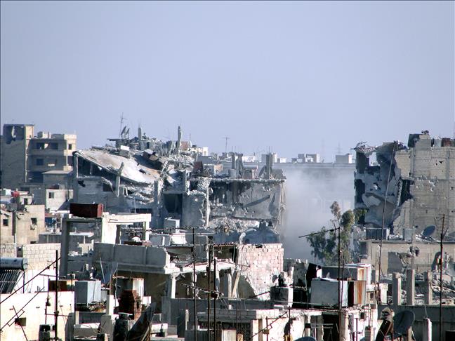 Pencere, çerçeve ve kapıların olmadığı, iskelet halinde kısmen ayakta kalan binalardaki yangın emareleri, bölgeye yönelik ağır bombardımanın izlerini taşıyor.