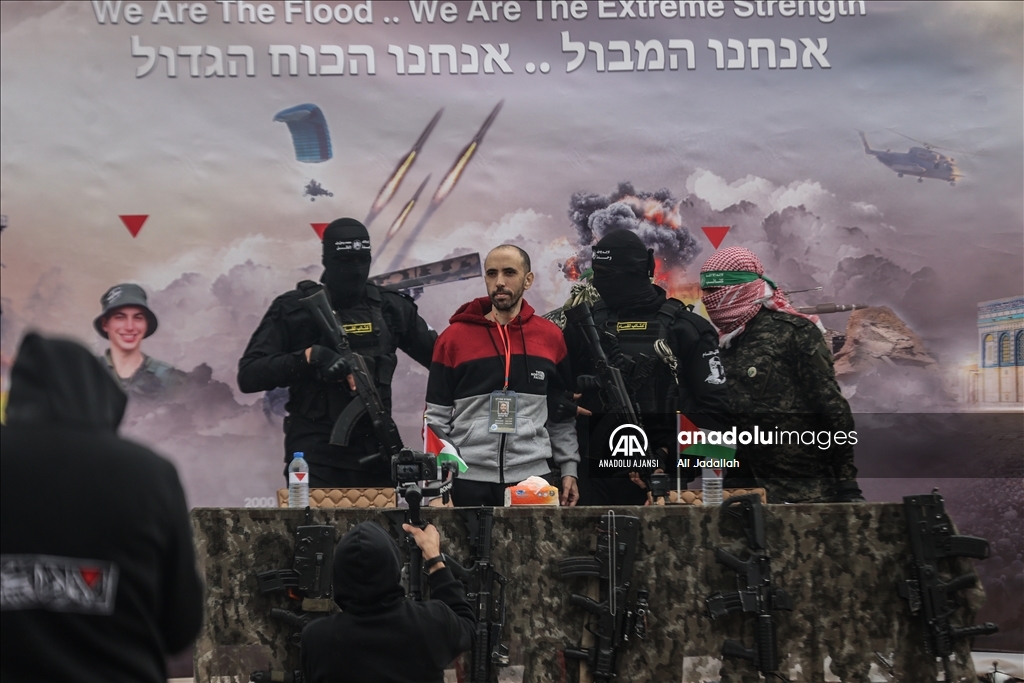 Öte yandan İsrailli 3 esir platformda Gazze Şeridi sakini Filistinlileri, Kassam Tugayları mensuplarıyla birlikte zafer işareti yaparak selamladı.