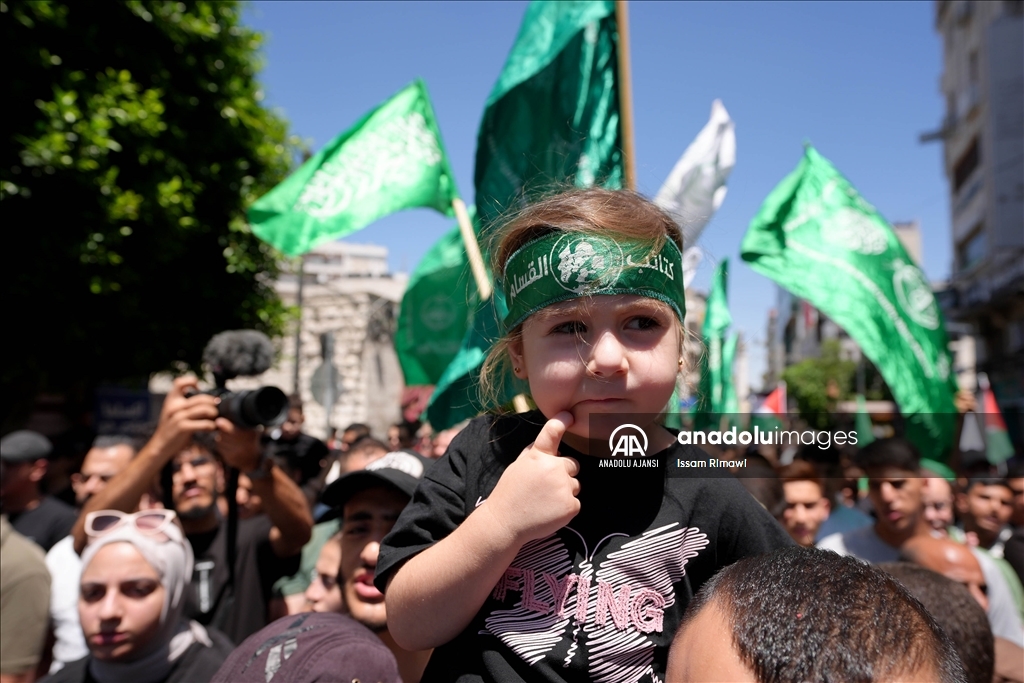 Batı Şeria'nın Ramallah kentindeki cadde ve mahallelerinde toplanan Filistinliler, Hamas ve Filistin bayraklarıyla yürüyüş yaptı.