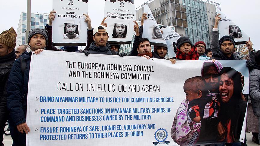 Hollanda'nın Lahey kentinde, Myanmar'daki Arakanlı Müslümanlara yapılan soykırım, Uluslararası Ceza Mahkemesi (UCM) önünde protesto edildi.