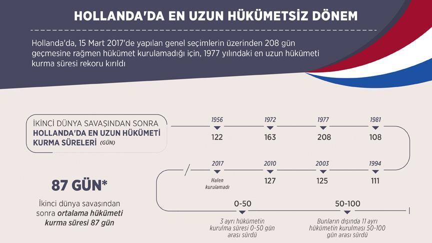 Hollanda'da 15 Mart 2017'deki genel seçimin üzerinden 208 gün geçmesine rağmen ülkede hala hükümet kurulamadı.