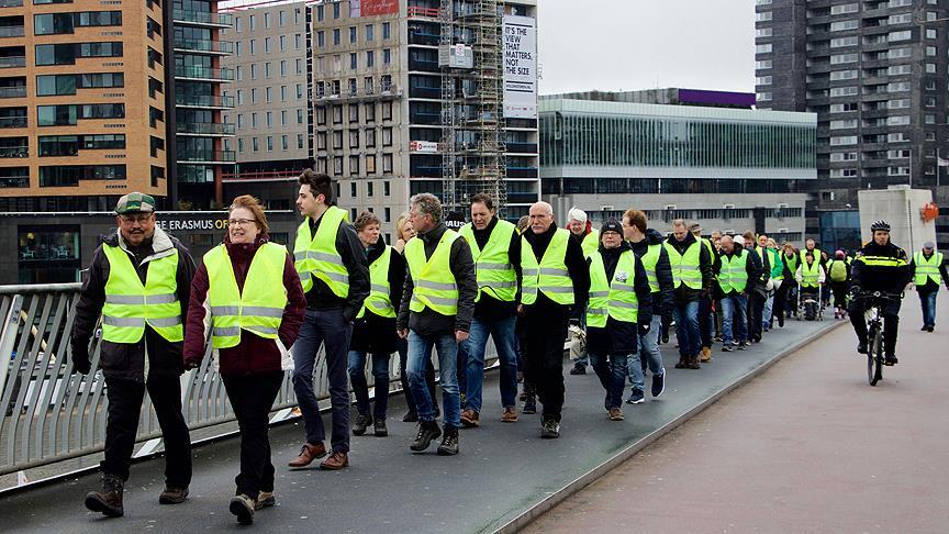 Rotterdam Erasmus Köprüsü'nde toplanan yaklaşık 50 sarı yelekli, köprüde yürüyüş yaptı. Bazı eylemcilerin giydikleri yeleklerde "Bizim adımıza ve bizim hakkımızda konuşma, bizimle konuş" ve "İslam'a hayır, mültecilere hayır." ifadeleri yer aldı.