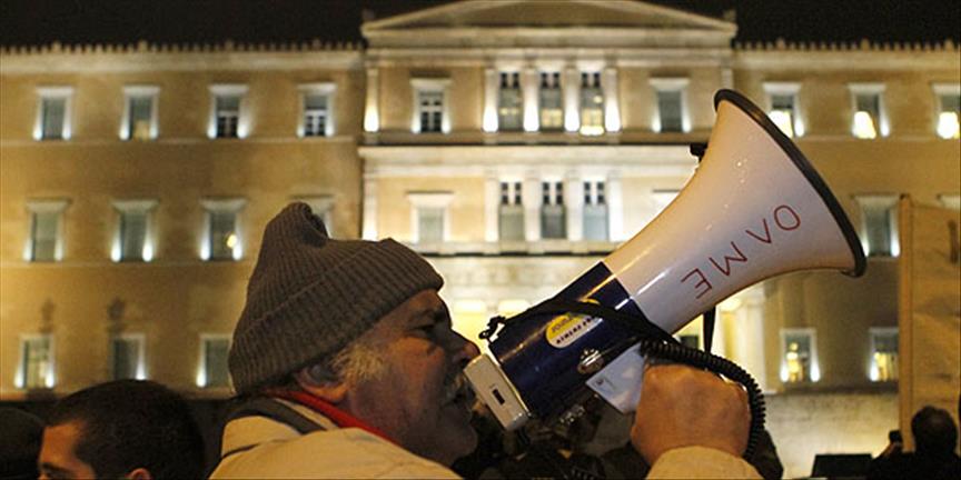 Polisin geniş güvenlik önlemleri aldığı Sintagma Meydanı'ndaki parlamento önünde bir araya gelen göstericiler halkı mücadeleye davet etti, borç anlaşması, memorandum ve yeni tasarruf önlemlerine karşı durmaya çağırdı.