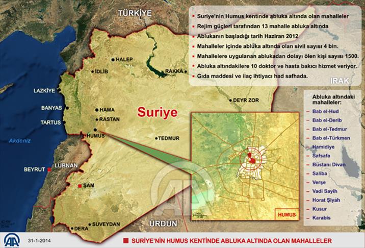 AA muhabirinin yerel kaynaklardan aldığı bilgiye göre, Humus'un Bab Hud, Bab Dureyb, el-Hamidiye, Bab Tedmur, Bab et-Turkmen, el-Safsafe, Bustan ed-Divan, es-Saliybe, el-Verşe, Vadi es-Sayih, Curatu'ş Şeyyah, el-Kusur, el-Karabiys ve el-Halidiye mahalleleri rejim güçleri ve Hizbullah militanları tarafından kuşatma altına alınırken, bu bölgelerde yaşayan çoğu kadın ve çocuk yaklaşık 4 bin sivilin açlık sıkıntısı yaşadığı, abluka nedeniyle su ve tıbbi malzemeye ulaşamadıkları kaydediliyor.