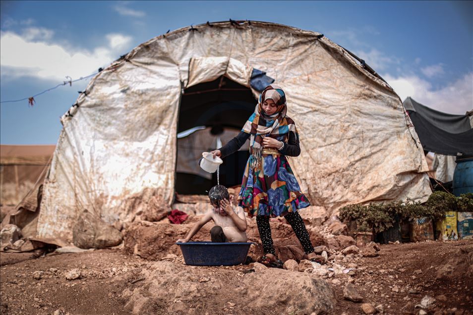 Suriye'nin kuzeybatısındaki İdlib ilinde zorla yerinden edilen sivillerin sığındığı kamplardaki siviller, aşırı sıcaklıklarla mücadele ediyor. Gün içinde 43 dereceye kadar çıkan sıcaklık, çoğunluğu kadın ve çocuğun yaşadığı çadırlarda zor anlara neden oluyor. Sıcaklık, güneş ışığına direkt maruz kalan çadırların içinde 50 derecenin üzerine kadar çıkıyor. ( Muhammed Said - Anadolu Ajansı )