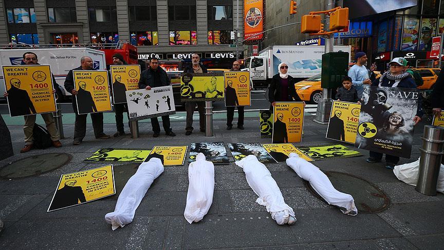 Esed rejiminin Suriye'nin İdlib kenti Han Şeyhun beldesinde gerçekleştirdiği kimyasal silah saldırısı New York'un Times Meydanı'nda protesto edildi.
