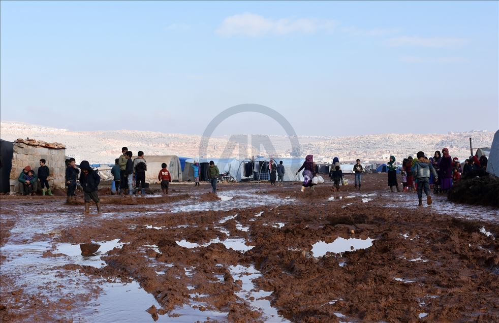İdlib'in Türkiye sınırındaki Sarmada ilçesi, evsiz kalan ailelere kucak açarken, buraya sığınan aileler, yağmur ve soğuğa dayanıksız çadırlarda zor günler geçiriyor.