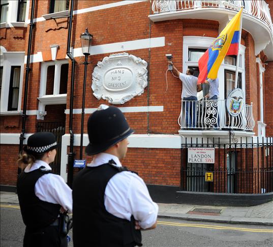 Başkentin turistik ve lüks semtlerinden Knightsbridge'in simgesi olan Harrods mağazasının hemen yanında bulunan Ekvador'un Londra Büyükelçiliği binası önünde, Londra polisi 24 saat nöbet tutuyor.