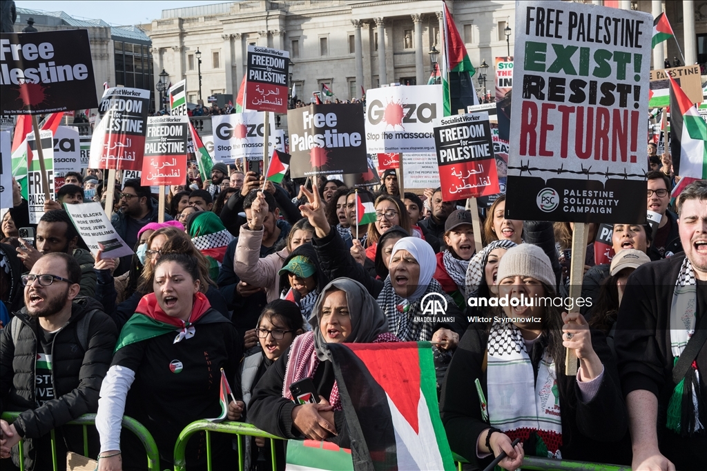 İsrail'in Gazze'ye yönelik saldırıları sürerken İngiltere'nin başkenti Londra'nın tarihi "Trafalgar Meydanı"nda bir araya gelen on binlerce Filistin yanlısı gösterici, "acil ateşkes" çağrısında bulundu.